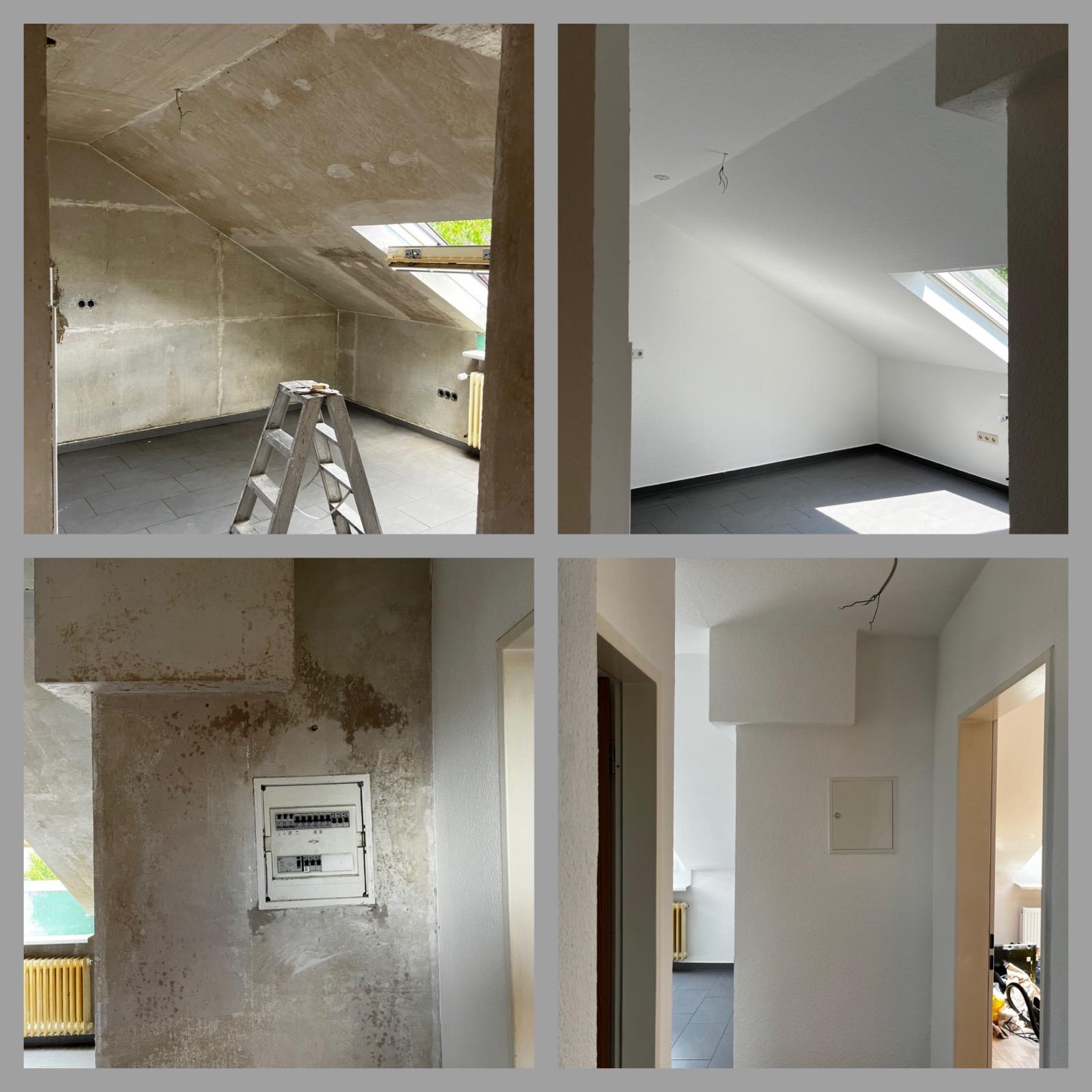 Vollständige Renovierung eines Dachgeschosses von der Entkernung über Putz- und Malerarbeiten bis zum fertigen Wohnraum. Professioneller Dachgeschossausbau mit fachgerechter Entkernung, hochwertigen Putzarbeiten und präzisen Malerarbeiten für modernen, bezugsfertigen Wohnraum unter dem Dach.