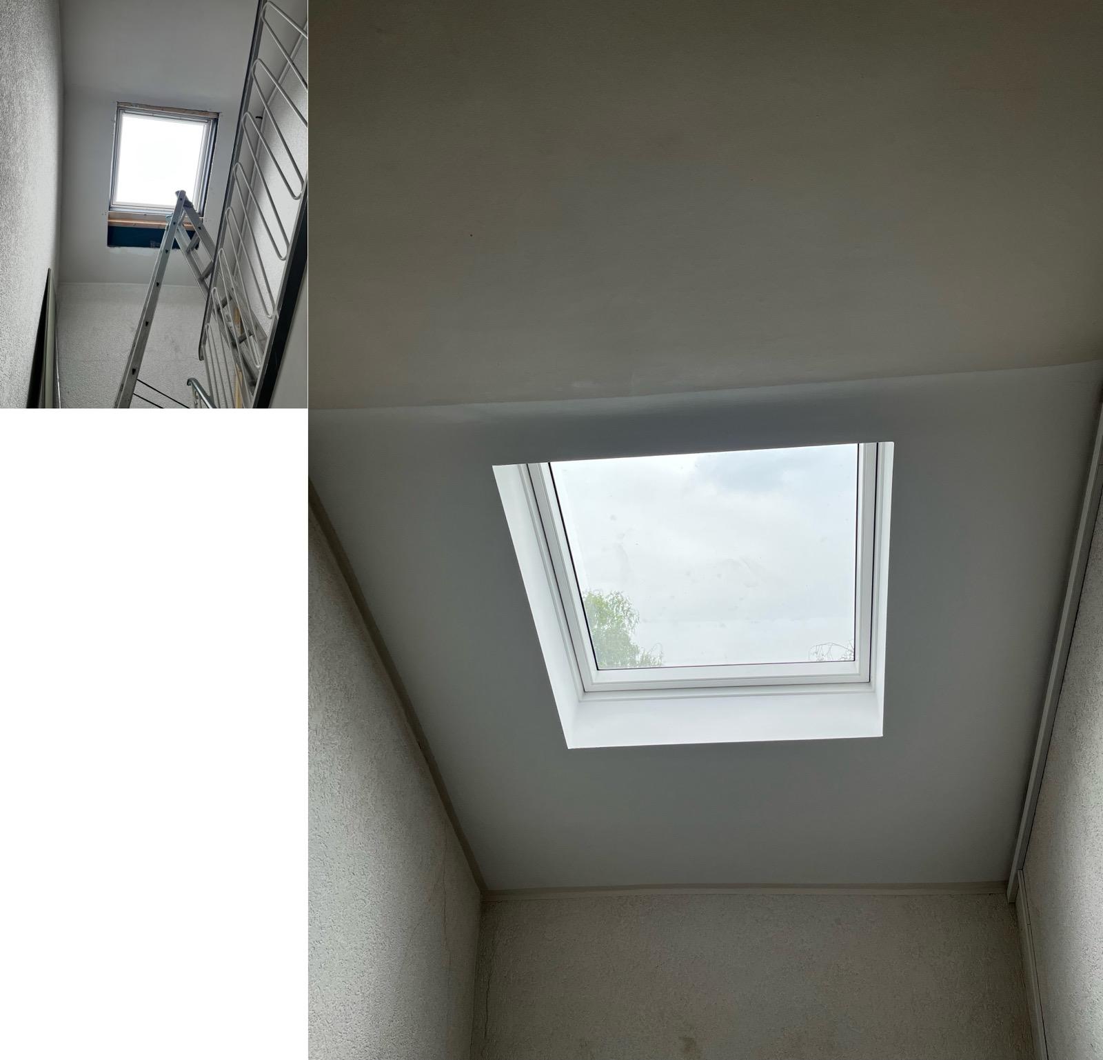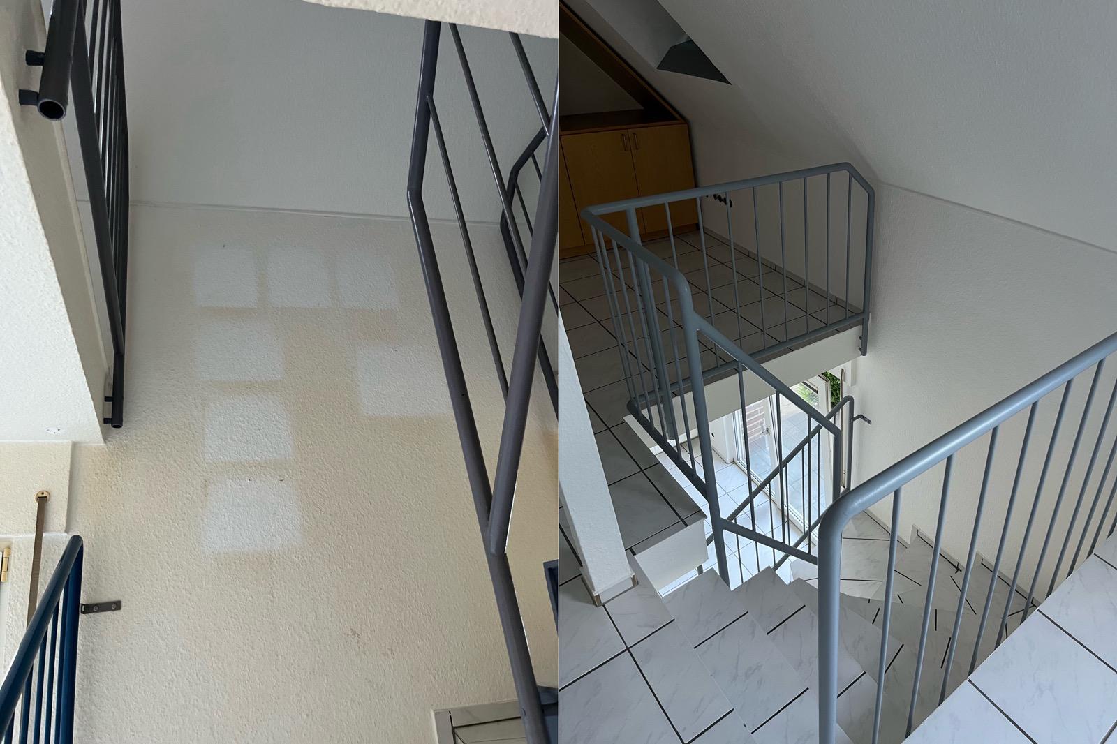 Professionelle Treppenhaussanierung mit neuem Geländer, frisch gestrichenen Wänden und erneuerten Dachfenstern für ein gepflegtes Erscheinungsbild im gesamten Treppenhaus.